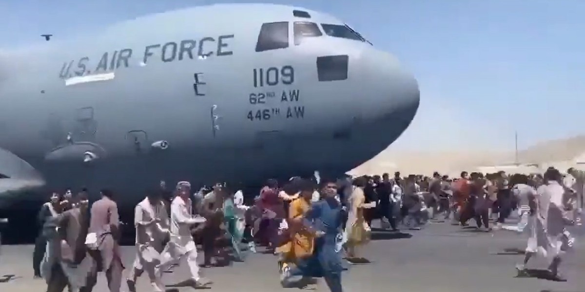 Na zdjęciu - Afgańczycy chcący dostać się do samolotu uciekającej armii USA, niedawnych "sojuszników"